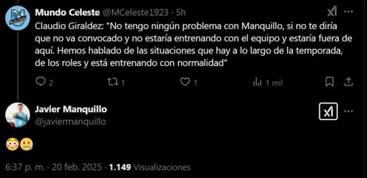 Javier Manquillo aprovechó la transcripción de las palabras del entrenador gallego en Mundo Celeste 1923, cuenta de X dedicada a la actualidad del Celta de Vigo, para responder. El madrileño, que acaba su contrato el próximo 30 de junio, lleva cinco partidos consecutivos en liga sin estar citado por Claudio Giráldez.