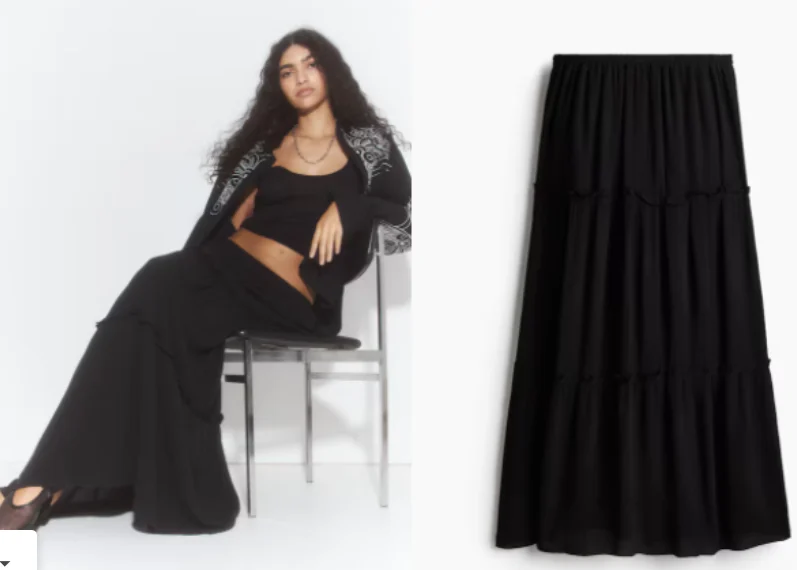 La falda maxi arrugada de H&M es una pieza que es más que un capricho, ya que combina elegancia y comodidad. Fabricada en tejido de viscosa, es una falda que tiene elástico estrecho en la cintura que garantiza un ajuste cómodo. Posee unos detalles de volantes sobre las caderas y el dobladillo rematado aporta un toque más femenino y sofisticado.