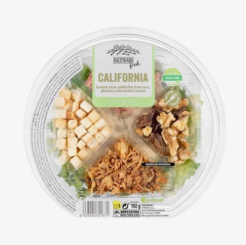 La Ensalada California es una de las más tentadoras, pero también una de las menos saludables. Contiene una base de hortalizas frescas con ingredientes como nueces, uvas pasas, bacon, cebolla frita y picatostes, todo acompañado de una salsa de miel y mostaza.
