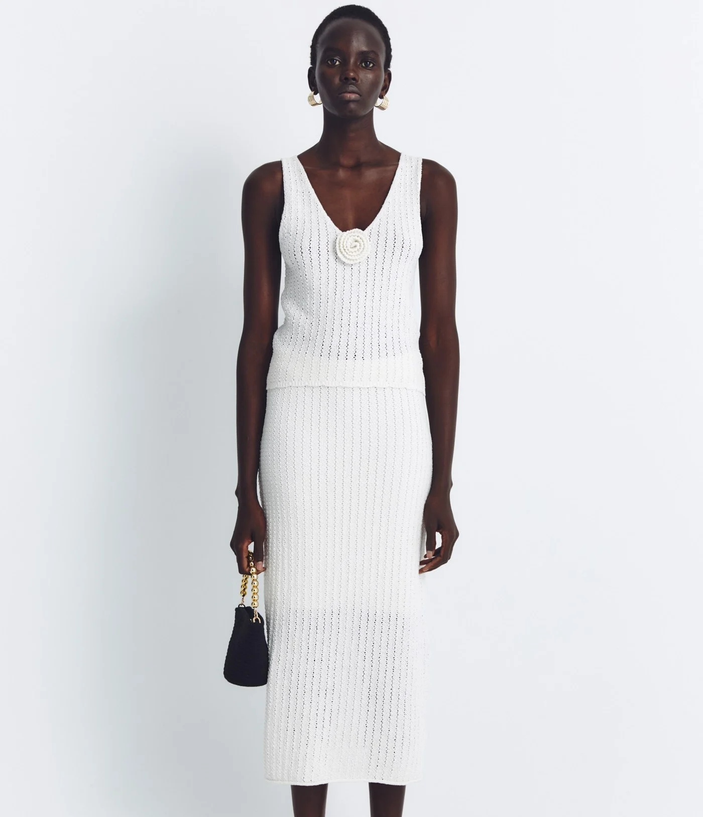 Se trata de un top de tirantes con una flor bordada en el centro, que combina con una falda midi de punto calado. La caída de la falda es fluida, lo que permite movimiento sin perder elegancia. Y el top, ajustado en la zona del busto, se puede llevar tanto solo como con una sobrecamisa o cazadora vaquera.