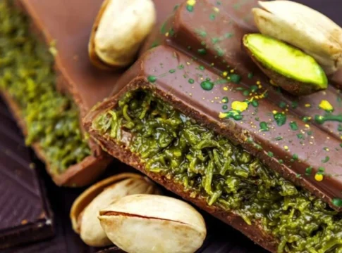 El formato mezcla chocolate con leche, pistacho triturado y masa crujiente inspirada en postres árabes. En su exterior, este chocolate suele decorarse con pan de oro y ofrecer un sabor refinado. Para muchos, no es solo un dulce, sino una obra maestra culinaria que rinde homenaje a las raíces árabes.
