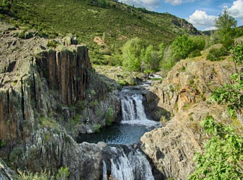 La Cascada del Aljibe no es una única caída, sino una estructura dual que multiplica su belleza. Se trata de dos saltos de agua consecutivos que, en conjunto, suman una altura considerable, creando un perfil escalonado de gran plasticidad. El primer salto, más modesto, prepara el terreno para la gran caída, una cortina de agua más alta y ancha que se precipita con fuerza en una gran poza de aguas cristalinas. Esta configuración de doble peldaño es lo que le confiere su personalidad única, un diseño natural que permite contemplar el recorrido completo del agua desde varios ángulos. La visión de esta doble cascada es hipnótica, un movimiento perpetuo que esculpe la roca y alimenta las pozas que, como su nombre indica, recuerdan a antiguos aljibes excavados en la piedra.