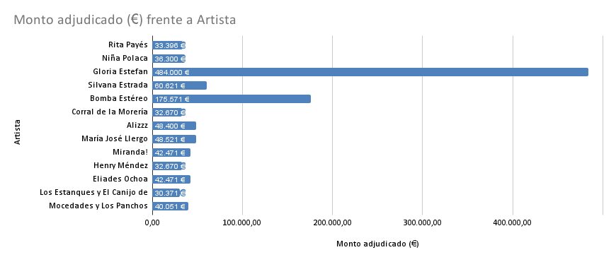 Lo cierto es que las adjudicaciones para los conciertos de estos días son bastante variadas. El principal premiado es Sony Music, como ya se mencionó que, con sus dos eventos, incluyendo a Gloria Estefan, alcanza los 526.471, casi el mismo monto total que el desfile de esta fecha. En segundo lugar, está Last Tour, aunque solo se encargue del concierto de Bomba Estéreo con sus 175.571 euros y, en tercer lugar, CityZen Music, promotora madrileña especializada en artistas latinas y encargada de los conciertos de Rita Payes, Henry Méndez, Eliades Ochoa y el de Mocedades y Los Panchos.
