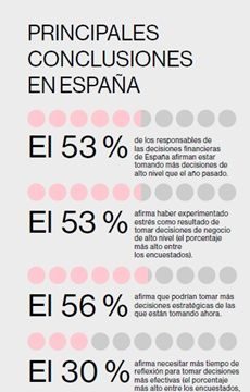 Según el estudio, un 53% de los directivos financieros españoles reconoce haber sufrido estrés al tomar decisiones de alto nivel, situando a España como el país más afectado entre los encuestados. Además, un 29% señala el burnout como un factor directo que contribuye a los bloqueos decisionales. A ello se suma que un 30% afirma necesitar "espacio mental" para tomar decisiones de calidad, el doble que en Reino Unido (14%).