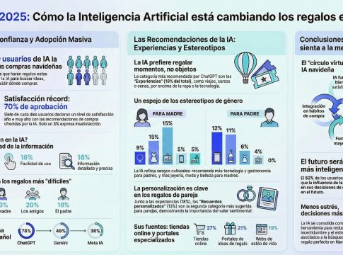La inteligencia artificial se ha convertido en el nuevo consejero para las compras navideñas de los españoles. Según un estudio realizado por la consultora Science 4 Insights en colaboración con QuestionPro, ocho de cada diez usuarios de IA (78%) la utilizará estas Navidades para buscar ideas sobre qué regalar a sus seres queridos. El estudio, que combina una encuesta a 1.006 usuarios españoles con un análisis de las recomendaciones que ofrece ChatGPT mediante la técnica de IA Listening, revela además que la satisfacción con estos asistentes es extraordinariamente alta: el 70% de quienes los han usado para decisiones de compra declara estar satisfecho con las recomendaciones recibidas.