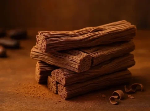 La Leña Vieja es una creación singular: finísimas láminas de chocolate superpuestas que imitan la textura y forma de la madera seca. Su nombre hace referencia precisamente a ese parecido visual y sensorial que evoca un tronco antiguo, crujiente y delicado.