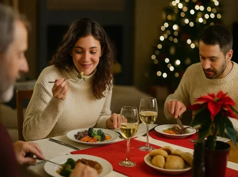En un ambiente festivo, con risas y conversaciones cruzadas, tendemos a engullir la comida casi sin masticar, lo que impide que las señales de saciedad lleguen a tiempo al cerebro. El estómago tarda aproximadamente 20 minutos en enviar la notificación de "estoy lleno" al hipotálamo; si comemos muy rápido, para cuando llega el mensaje ya habremos ingerido el doble de lo necesario. Masticar cada bocado con calma y dejar los cubiertos sobre la mesa entre bocado y bocado nos obliga a ralentizar el ritmo y a disfrutar más de los sabores.