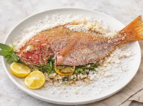 El secreto empieza antes de meter el pescado al horno: la mezcla de sal gruesa con claras de huevo tiene que tener consistencia de arena mojada, lo suficientemente densa para moldearse sin desmigarse. Una costra fina o con huecos deja escapar el vapor y el resultado es un pescado reseco por dentro.