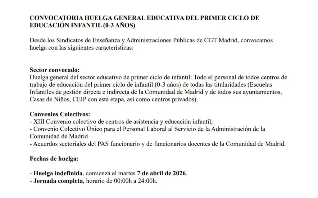 Miles de trabajadoras de las escuelas infantiles de la Comunidad de Madrid se suman esta semana a una huelga indefinida que arrancó este 7 de abril y afecta al ciclo de 0 a 3 años. ¿Los motivos? Una década de deterioro de las condiciones laborales en un sector donde los salarios rozan el Salario Mínimo Interprofesional, las ratios de niños por educadora se disparan, los recursos se estiran hasta el límite y el peso de la privatización marca la gestión diaria de los centros.