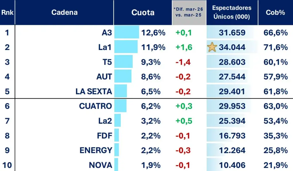 Antena 3 encadena en marzo su vigésima victoria mensual consecutiva con un 12,6 % de cuota de pantalla, manteniéndose como la cadena más vista del país pese a ceder unas décimas respecto a febrero. La 1 se sitúa inmediatamente detrás, con un 11,9 % de share, animando a una remontada que ha ido estrechando el margen con la cadena de Atresmedia en los últimos meses. Telecinco, por su parte, respira gracias al empuje de 'Supervivientes', pero se mantiene por detrás del tándem de cabeza.
