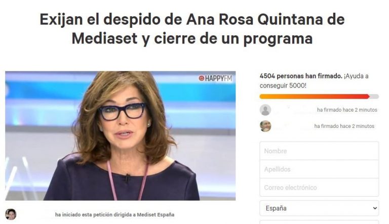 De esta forma, en las redes no tardó en hacerse Trending Topic una petición, dirigida a Mediaset, tanto de despido contra Ana Rosa como para la cancelación de su programa de la parrilla de Telecinco. Las redes no solo han lanzado esa petición, sino que parece que han tomado la decisión de organizarse y abrir una propuesta en la página change.org para que Mediaset eche el cierre definitivamente al programa, con casi cinco mil firmas registradas. Sea como fuere, sus reuits a Isabel Díaz Ayuso y al partido Vox están revolucionando Twitter: "Mediaset España: Exijan el despido de Ana Rosa Quintana de Mediaset y cierre de su programa - ¡Firma la petición!", es el mensaje que acompaña cientos y cientos de posts.