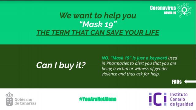 Las farmacias han derivado a 20 mujeres con el protocolo Mascarilla-19. Además de los recursos que ya existían, el ICI ha impulsado en este periodo de confinamiento en los hogares otro tipo de recursos para mejorar la atención como el protocolo Mascarilla-19, desarrollado en colaboración con los colegios profesionales de farmacéuticos de las Islas. Durante este periodo de alarma, las farmacias isleñas han derivado a un total de 20 mujeres que acudieron a pedir auxilio empleando el protocolo Mascarilla-19, en dos de los casos tuvieron que gestionar una acogida inmediata para que abandonaron el hogar que compartían con su agresor.