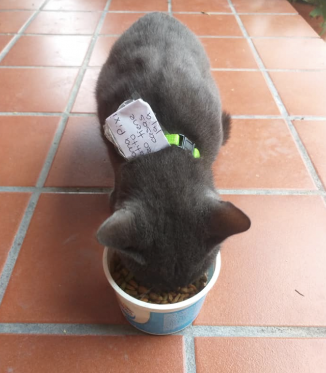 El gato continuó con sus costumbres y salió a pasear con el mensaje a cuestas. Al regresar, 'Pixi' portaba otra nota.