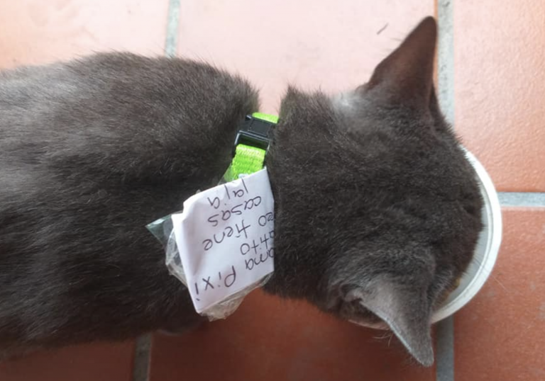 Las siniestras maniobras de la mascota salieron a la luz cuando una de las familias le puso un collar al minino. Ante las sospechas, la mujer que creía ser la legítima dueña del animal, decidió colgar una nota de su collar.
