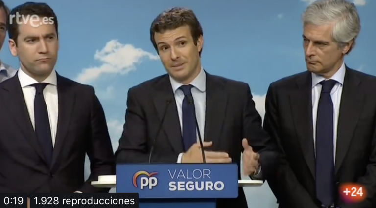 Ante una abarrotada sala de prensa en Génova, tras el derrumbe histórico del PP, al caer de 134 a 66 escaños, y rodeado por la cúpula del PP, Casado llegó con gesto sereno y reconoció que “el resultado ha sido muy malo” aunque siga siendo “el partido líder de la oposición y del centro-derecha”.